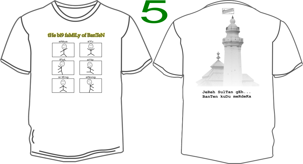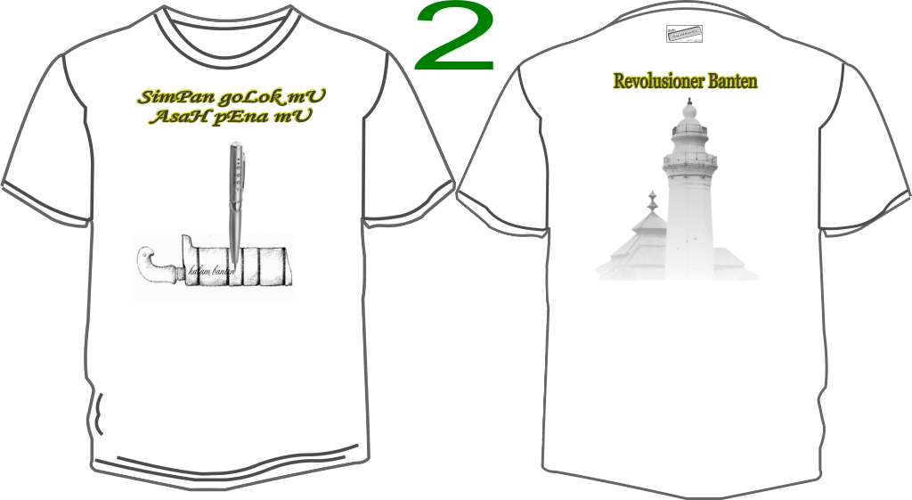 Kaos Khas Banten ini belum kami luncurkan karena masih banyak sekali pemikiran-pemikiran yang masih tertuangkan pada kertas-kertas rencana kami yang selanjutnya, kaos ini bagian depan yang mencirikan panggilan kepada anak banten dengan gambar tepat didada kaos